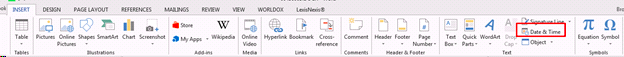How do I make sure my documents/form letters always show the correct dates? January 22, 2019 21:46 For Word documents: Click the “Insert” tab on the top, then select “Date & Time” And select the format that you would like. Comments 0 comments Please sign in to leave a comment.