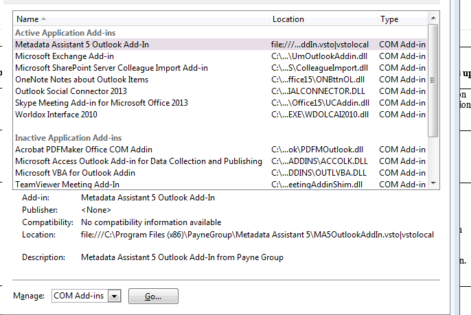 How do I enable or disable an add-in in Outlook? March 14, 2019 22:24 Updated In outlook: Click on File -> Options Click "Add-Ins." Press “Go” at the very bottom of that window. Then check or uncheck whichever add-ins you want to enable or disable. Click OK. Then close and reopen Outlook. Comments 0 comments Please sign in to leave a comment.